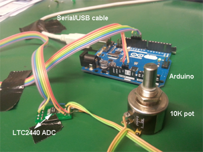 A VERY BASIC WAY TO TRY THE LTC2440 An absolute minimum circuit But be very careful. This circuit is very primitive and a single error could damage the ADC. The basic idea here is to simplify the ADC startup and coding to an absolute minimum. The problem with this circuit is that it uses the five volts from the Arduino board which is from the PC. This source of voltage to drive the ADC is extremely noisy. The absolute maximum voltage at the LTC2440, pin 2,3, and 5 is 5 volts. It is best to input less than 5 volts at pin five because 5 volts is so close to damaging the chip.